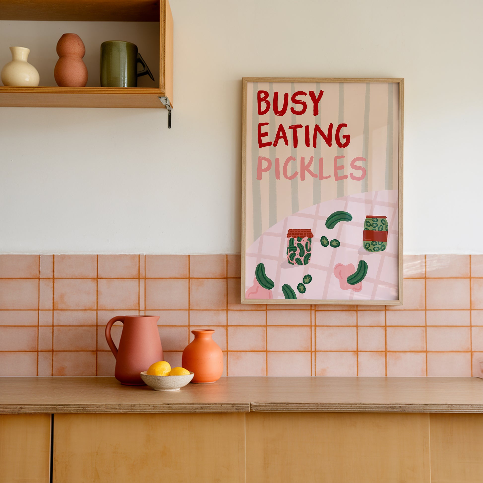 Calling all pickle lovers! Add a splash of fun to your space with the Busy Eating Pickles Print. Bursting with vibrant greens, reds and pinks, this playful design celebrates pickle lovers everywhere. Perfect for brightening your kitchen or dining area.