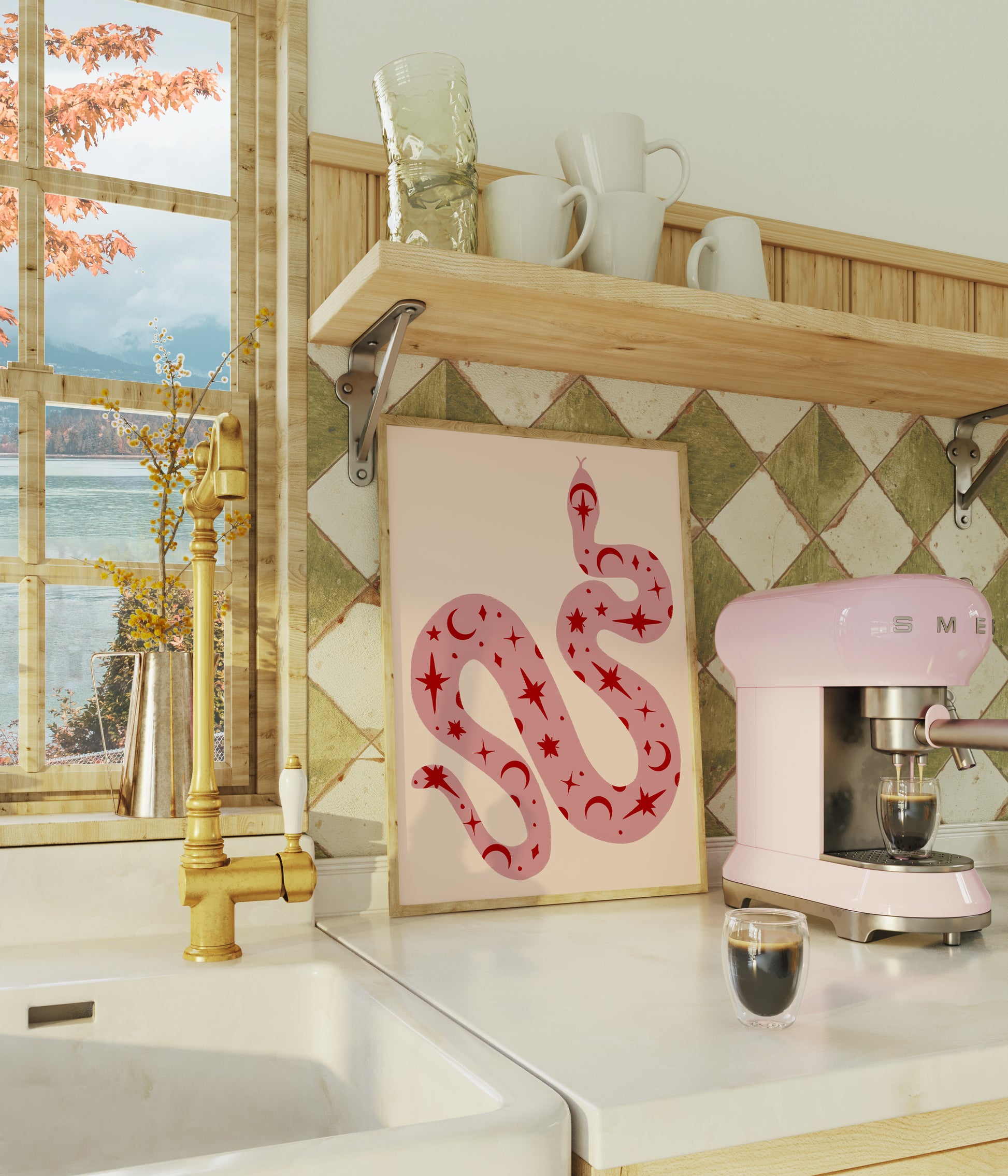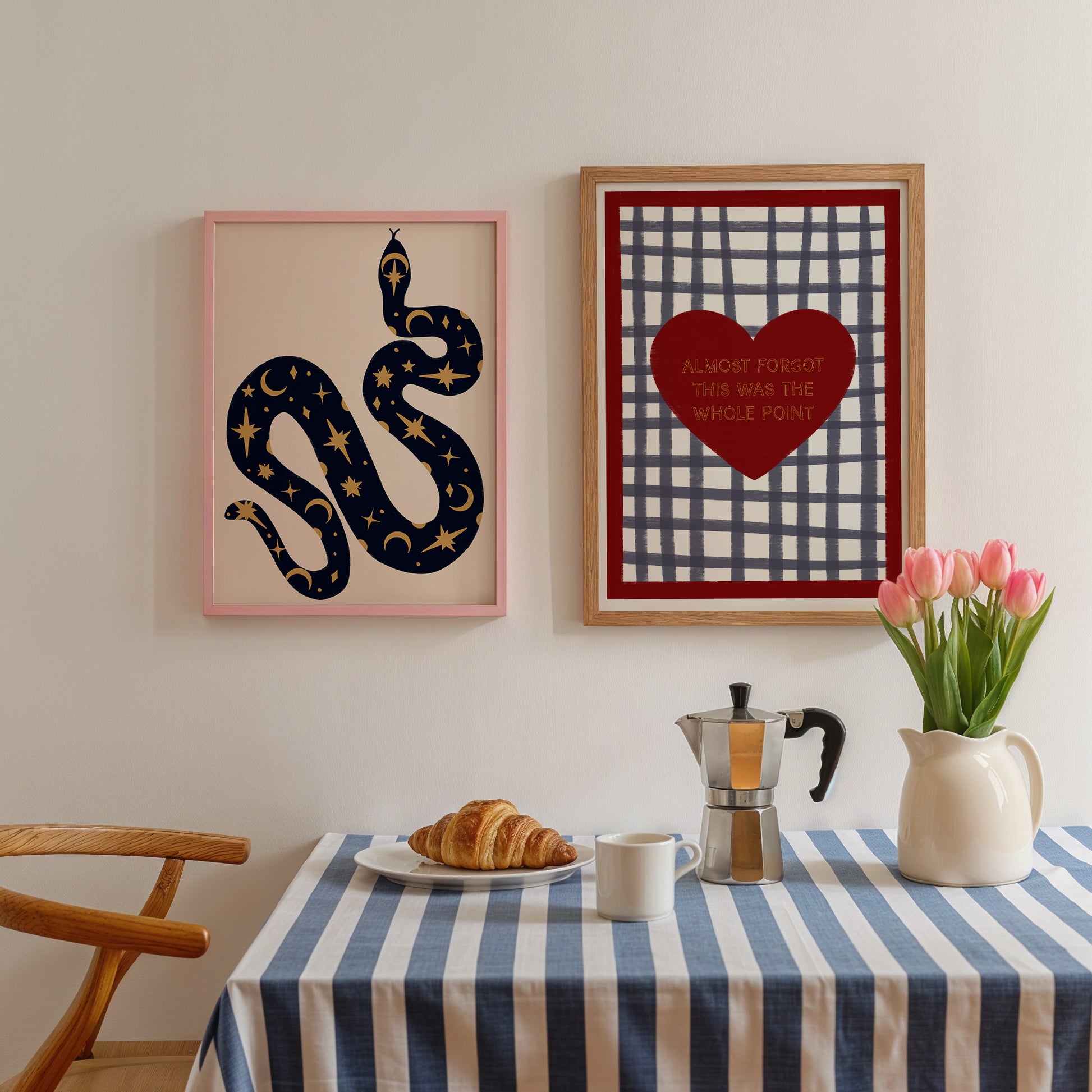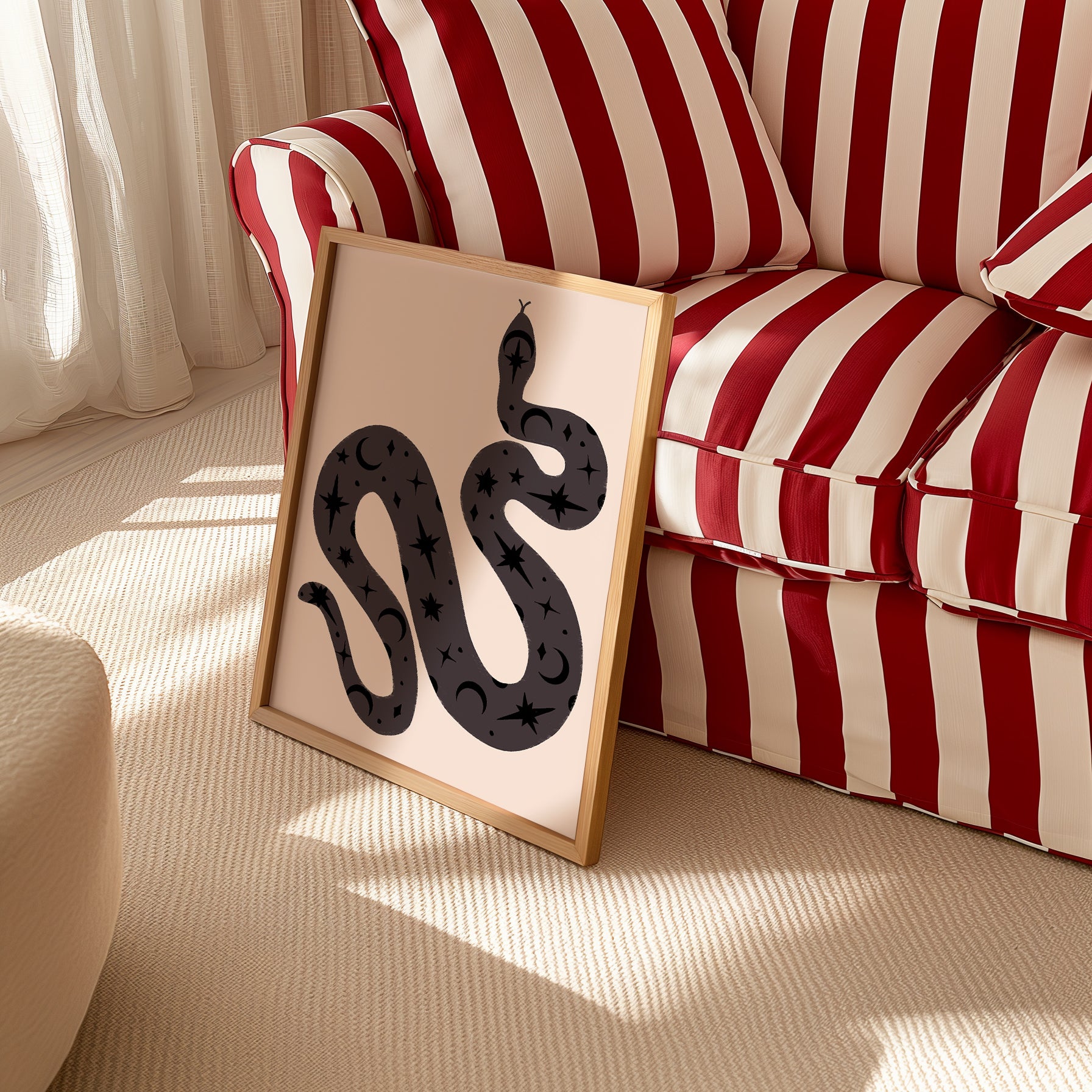 Our Celestial Snake print is hand drawn and available in four different colour ways to suit any room in your house. Perfect for adding a hint of colour or grunge depending on which theme you pick.