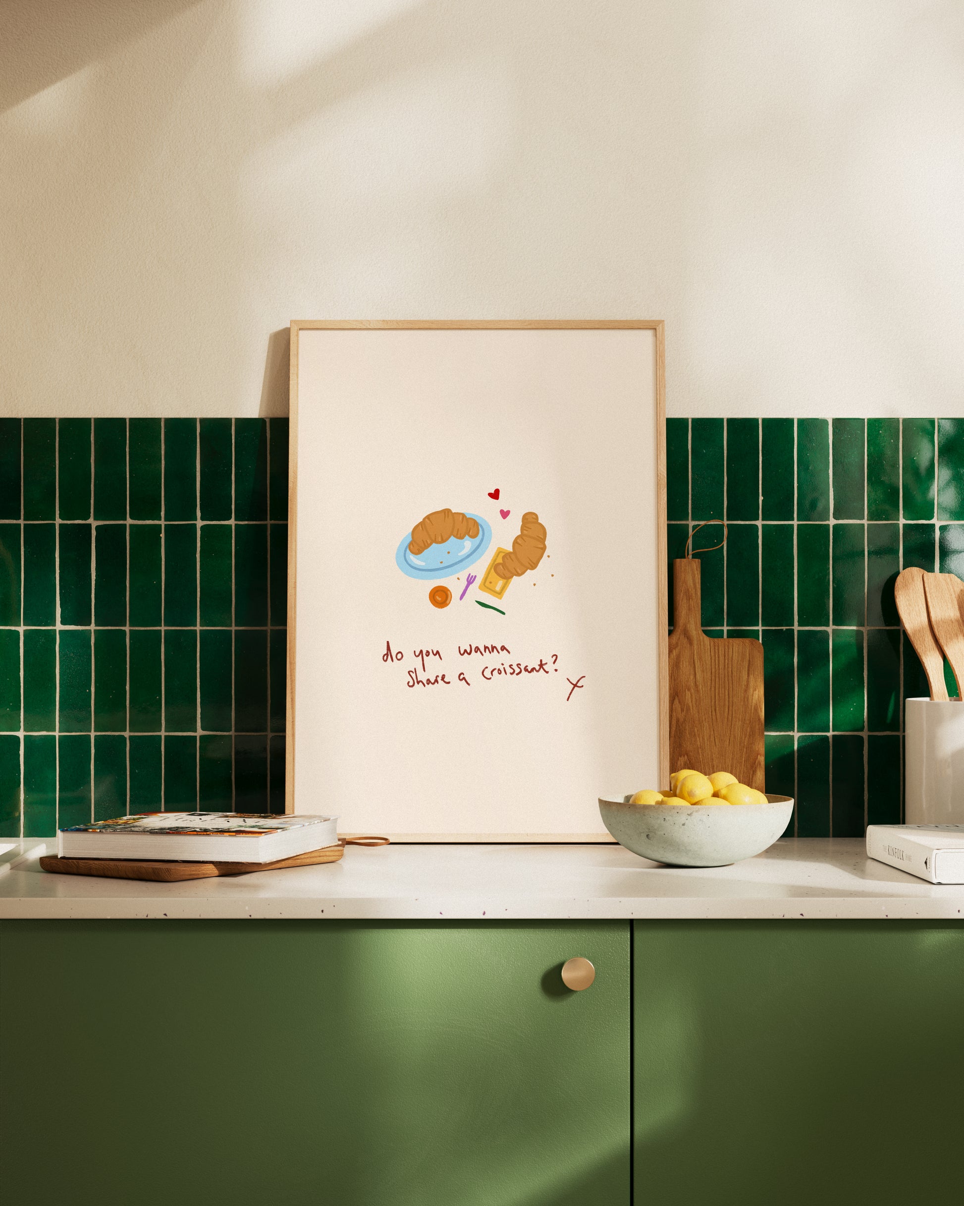 Sweeten your walls with our Do You Wanna Share A Croissant print. This hand drawn print reminds you of those beautiful moments as a couple, the ability to share a buttery croissant and enjoy each others company. Sometimes in life, it's the day to day moments that really spark joy and gratitude, and that's what this print is all about.