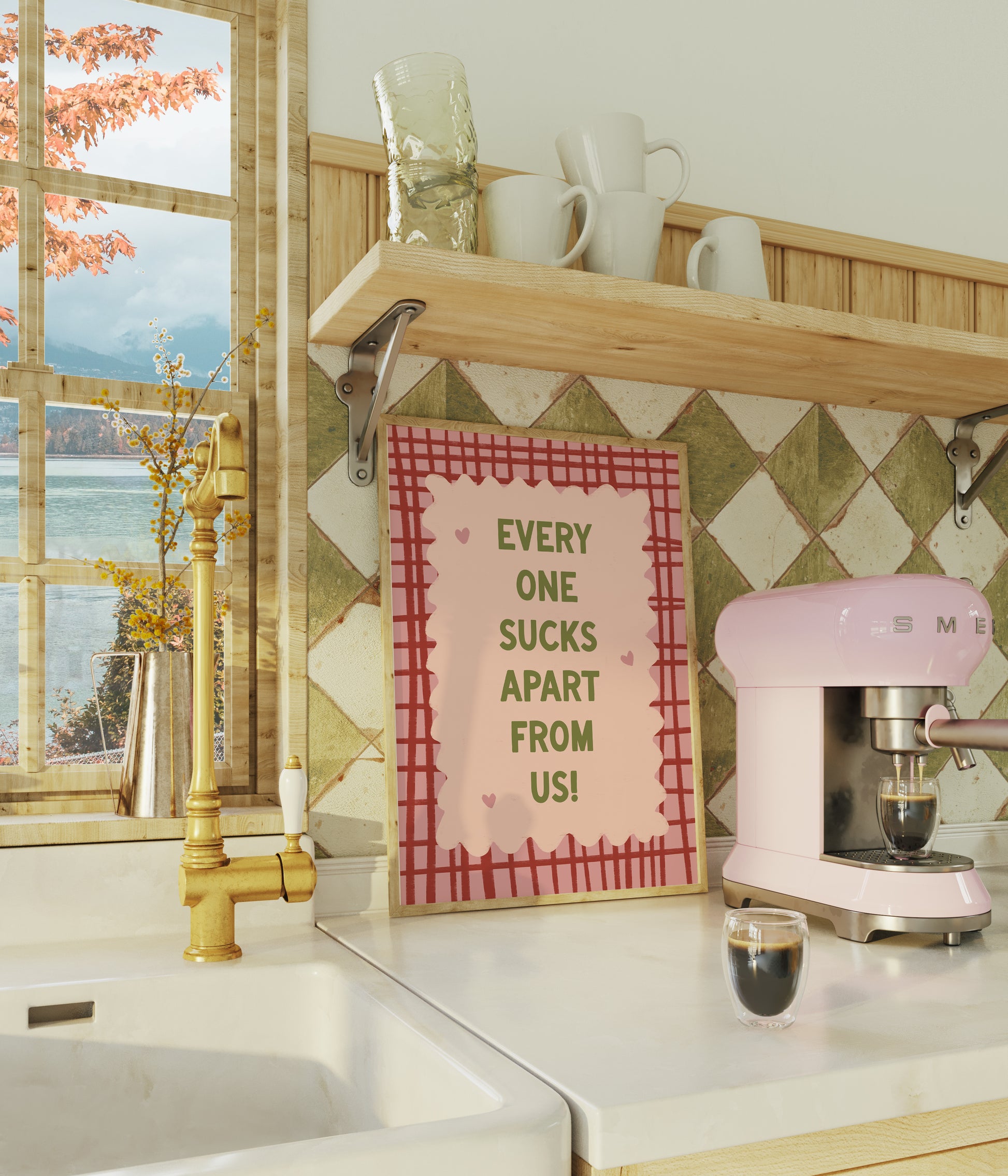 Have you ever felt like your relationship was the only one that didn't suck? Well now there's a print for that! Our Everyone Sucks Apart From Us! print is a funny reminder that the best bubble to be in, is often your own. Hand drawn in pink and green hues, it's perfect for a bedroom valentines gift.