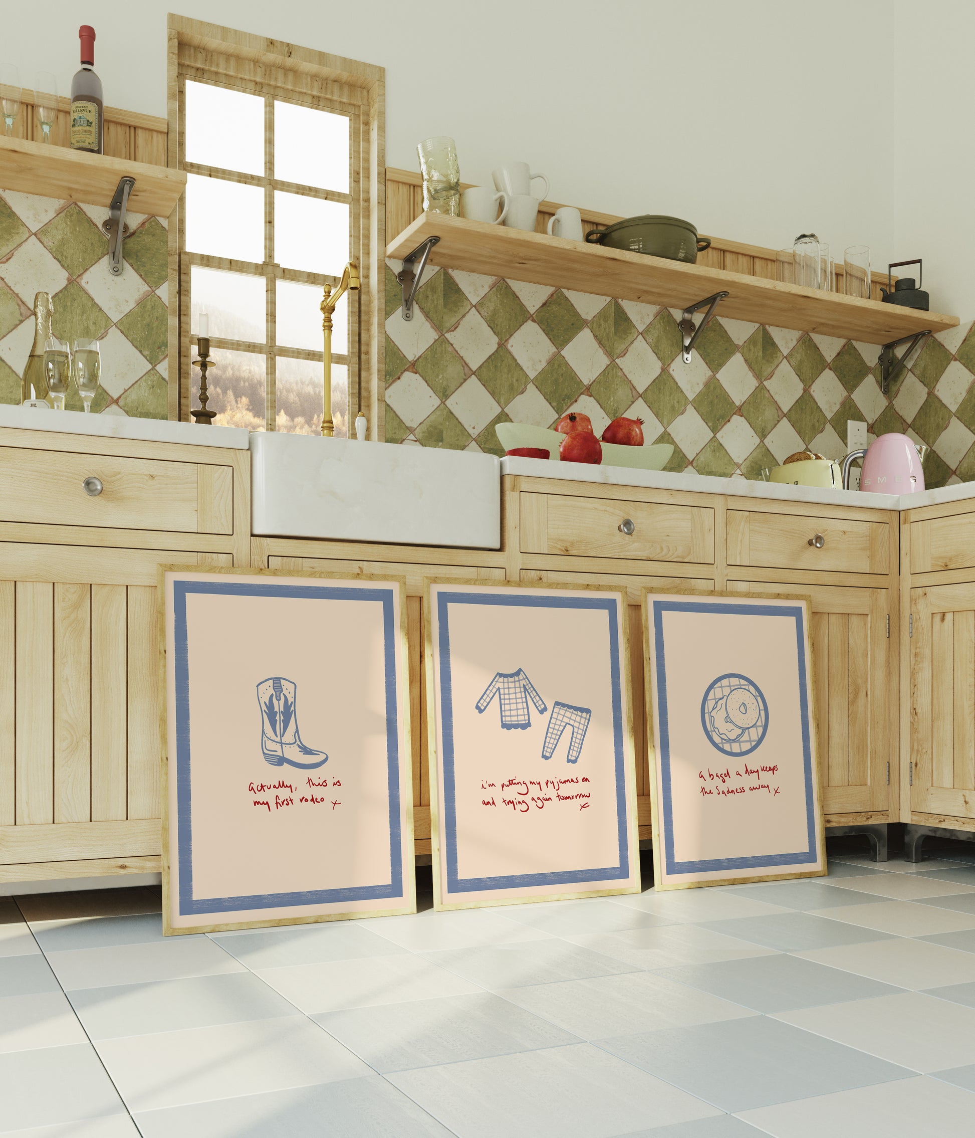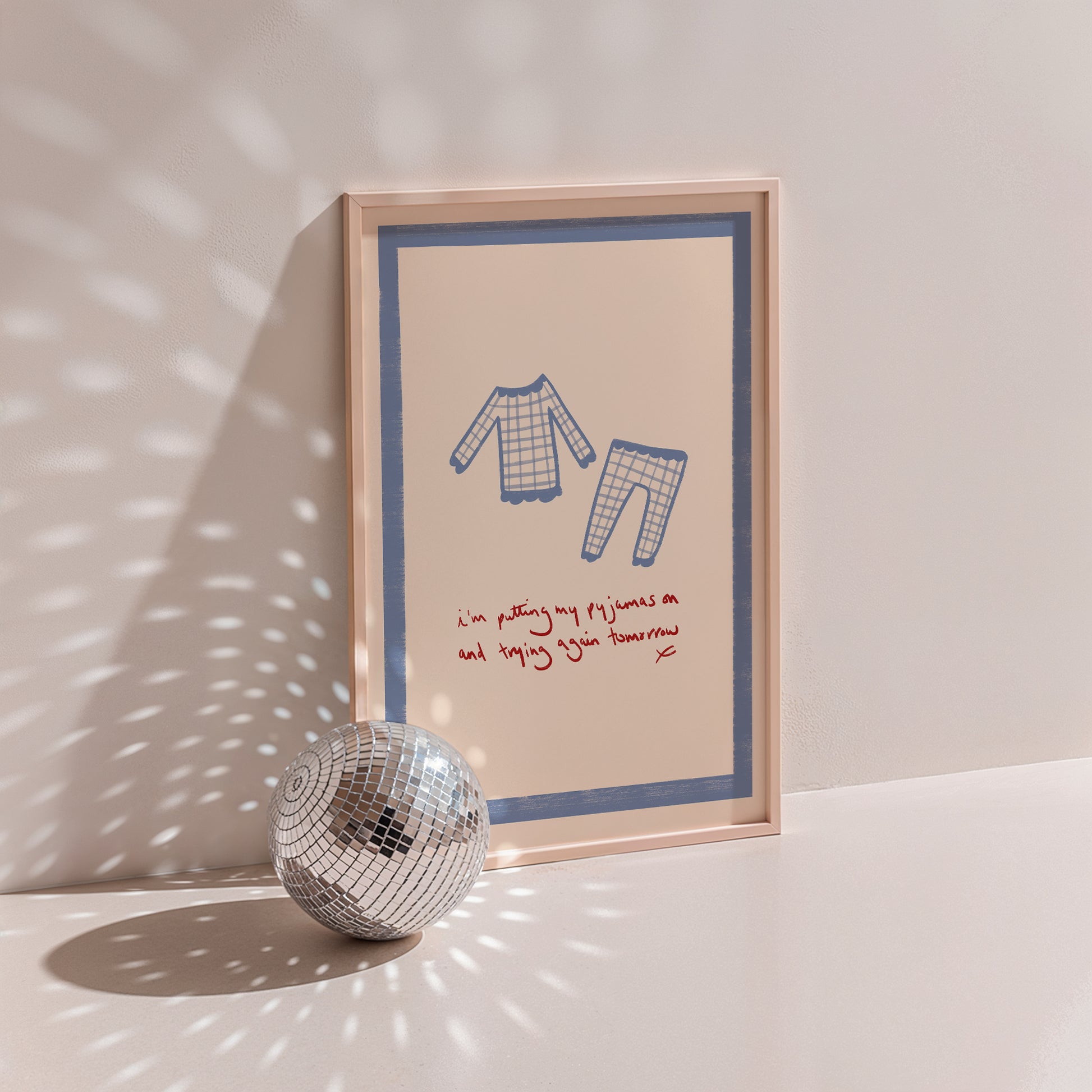 Not every day is perfect, that's what pyjamas are for. Celebrate the 'let's try again' days with our I'm Putting My Pyjamas On And Trying Again Tomorrow print. Hand drawn in blue and red hues, ready for your bedroom wall to remind you that some days are just meant for pyjamas and duvets, and that's okay.