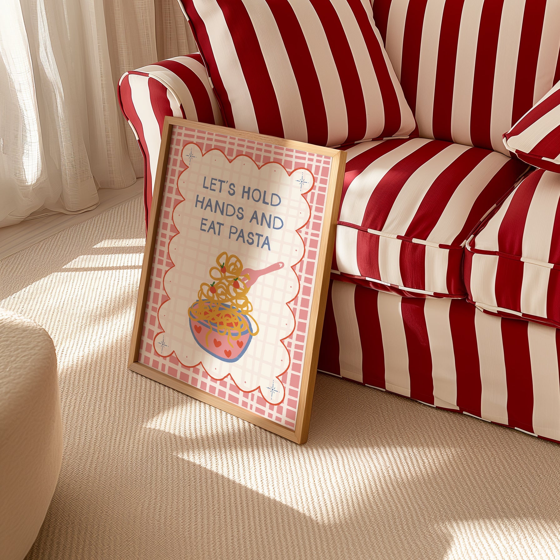 Transform your space into a pasta fuelled love letter and capture what truly matters, carbs!!! Our Lets Hold Hands And Eat Pasta print helps to remind you of intimate moments shared over candlelit (pasta) dinners and holding hands with the love of your life. Hand drawn and perfect for your kitchen or dining room to remind each other of your favourite pastime.