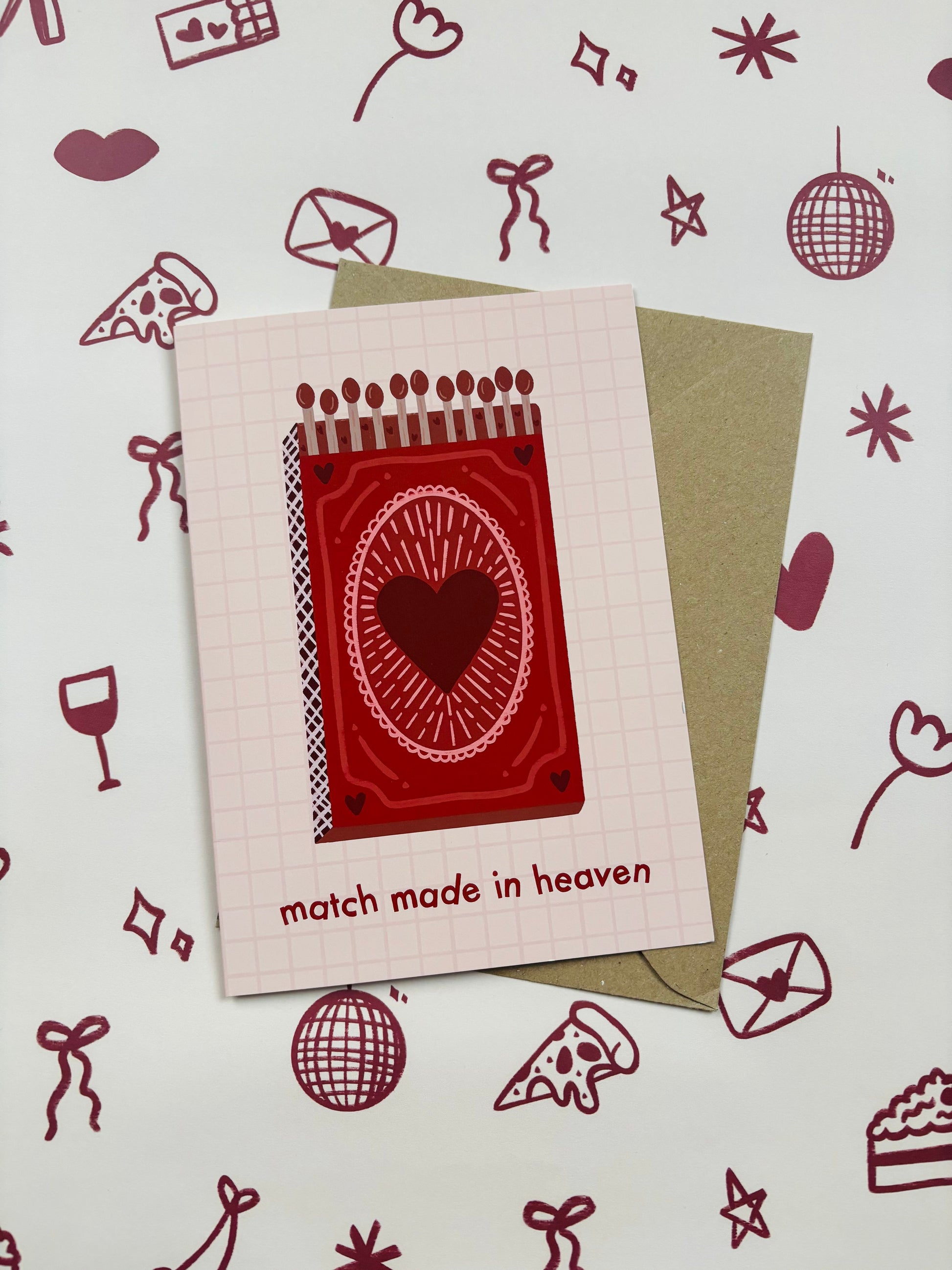 Celebrate your match made in heaven with our hand drawn matchbox card. Perfect for Valentine's, anniversaries, engagements or even a wedding to let the happy couple know you think they're the best couple.