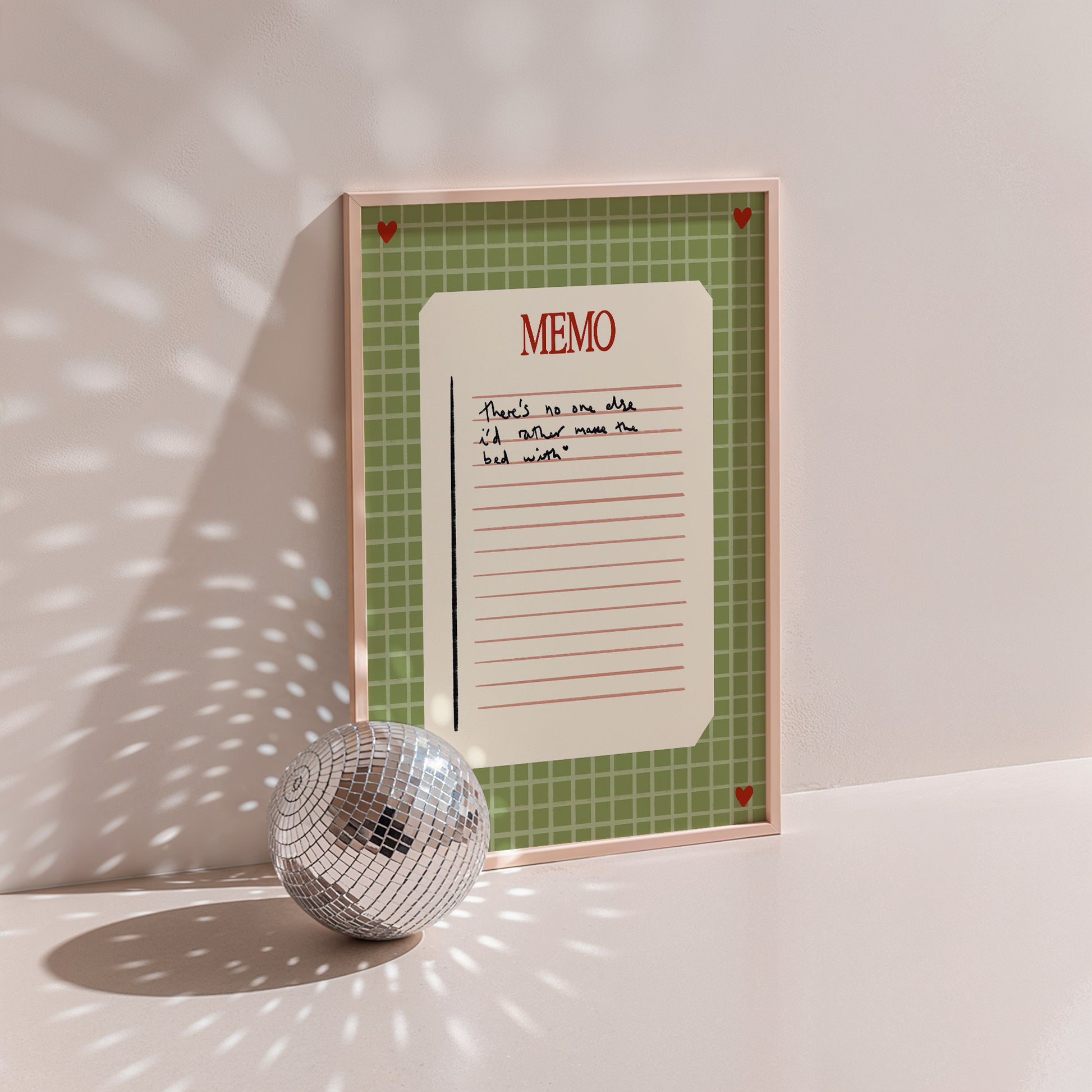 Our 'There's No One Else I'd Rather Make The Bed With' Green Memo Print helps to transform everyday chores into cherished moments. Perfect for couples who find joy in life's simple routines together, this piece celebrates the quiet intimacy of shared domestic bliss. The heartfelt message reminds you that the best moments aren't always grand, they're the ordinary ones spent with someone special. Ideal for bedrooms, laundry rooms, or anywhere you want to infuse your space with gentle romance and humour. A thoughtful gift for partners who appreciate the beauty in togetherness, no matter the task.